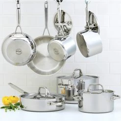 With the professional-quality performance of the Anolon Tri-Ply Clad Stainless Steel 12-Piece Cookware Set, make the most of fresh seasonal ingredients in a variety of dishes. Create creamy stone-ground grits and rice pilaf with golden raisins in the saucepans, or sear grass-fed lamb chops and sauteed vegetables in the skillets.