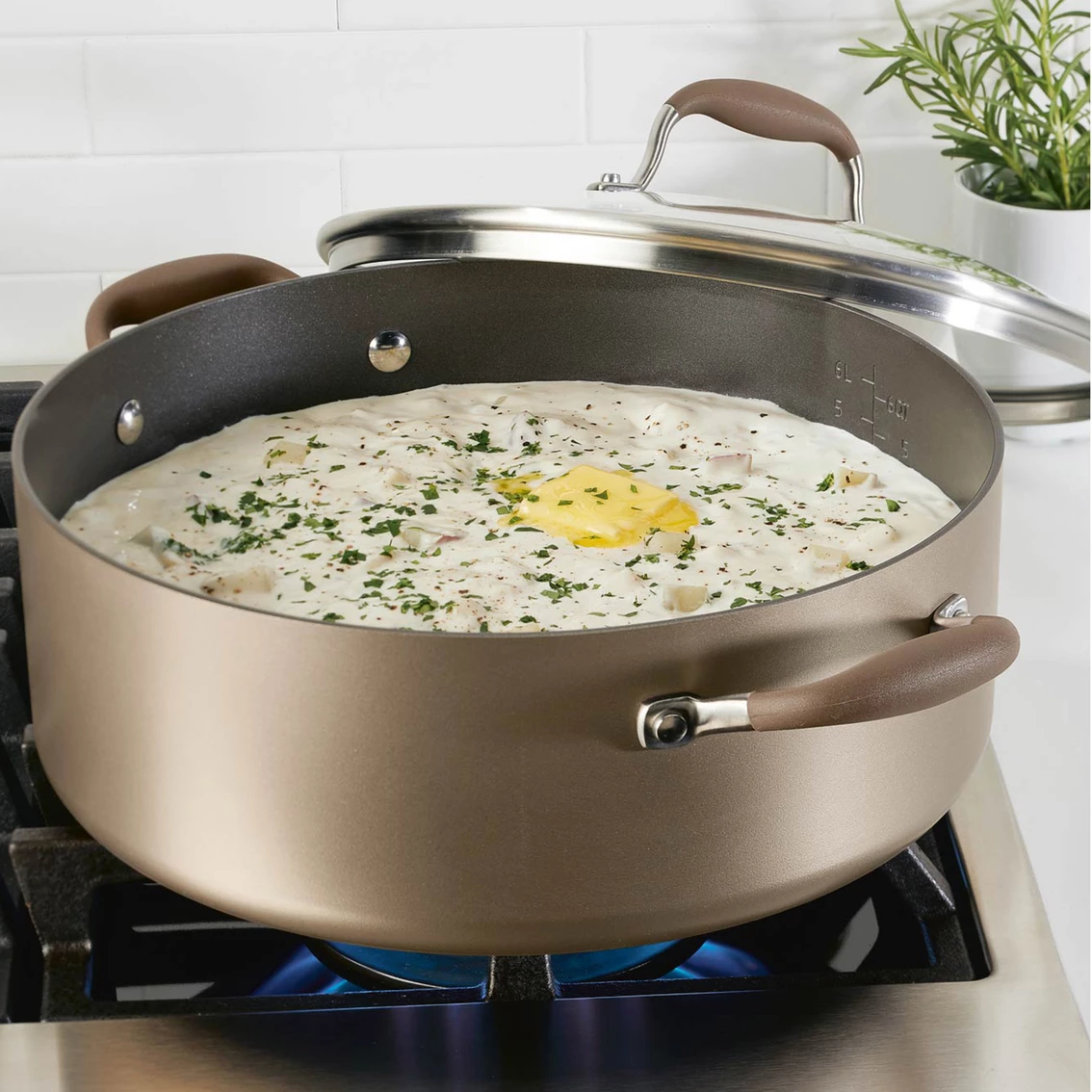 -Comfortable Anolon SureGrip handles and measuring marks on the stockpot make everyday cooking more enjoyable, and the stockpot is oven safe to 400 degrees Fahrenheit for recipes that start on the stovetop and finish in the oven.