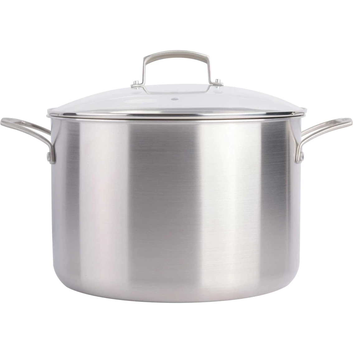 Equip your kitchen with versatile and hardworking essentials. The Babish 12-quart Tri-ply Stainless Steel Stock Pot with Lid has a large capacity to hold pastas, soup bases, seafood boils, and more. Made from sleek stainless steel, it features better heat conductivity from its tri-ply construction and seamless aluminum core. Riveted handles provide support and balance when mixing, lifting, and serving. Its tempered glass lid allows you to monitor cooking progress, while its vents help release steam to prevent overflow. Versatile and durable, this stock pot is safe to use on gas, electric, ceramic, glass, and induction stovetops. Hand wash recommended.