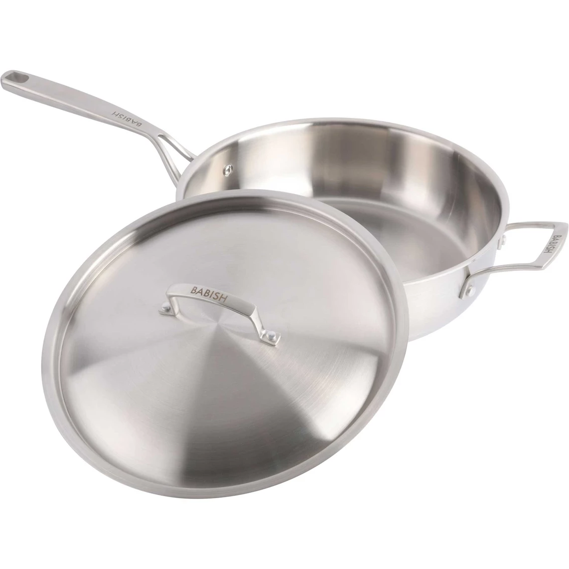 Deliver delicious meals any time of the day with the Babish 5-quart Tri-ply Stainless Steel SautΓ© Pan with Lid. Made from tri-ply stainless steel with a seamless aluminum core, this cookware piece is great for sautΓ©ing, frying, and reducing sauces. It offers double-riveted handles for comfort and control and a stainless steel lid that retains flavors and moisture. Versatile and durable, this pan is safe to use on gas, electric, ceramic, glass, and induction stoves. Hand wash recommended. Oven safe up to 500 degrees F. Model: 131287.02R.