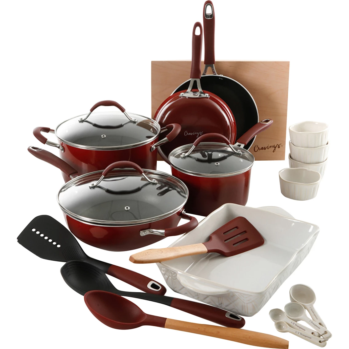 Prep, cook and create crave-worthy moments with this 22-piece nonstick cookware set from Cravings by Chrissy Teigen. Designed to inject fashion and function into food prep, the set includes the everyday essentials you need to prepare a wide range of delicious dishes. The set includes one 5.5-quart Aluminum Stock Pot with Glass Lid, one 3.5-quart Aluminum Everyday Pan with Glass Lid, one 2.5-quart Aluminum Saucepan with Glass Lid, one 1-quart Aluminum Saucepan with Glass Lid, one 9.5-in. Aluminum Frying Pan, one 9.5-in. Pre-seasoned Cast Iron All-Purpose Pan, one 4-piece Ceramic Measuring Spoon Set, one 3-piece Ceramic Pinch Bowl Set, one 14-in. Ash Wood Cutting Board, one 2-piece Silicone Tool Set with Wood Handles and one 2-piece Nylon Tool set. Handwash only.