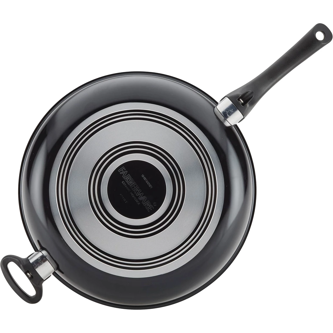 Sizzle and sear with superior ceramic nonstick confidence using the 12.5 in. Glide Copper Ceramic Nonstick Deep Skillet from Farberware. Constructed from fast and even-heating aluminum, this deep skillet boasts CopperSlide technology for effortless nonstick food release and easy cleanup of gooey one-pan recipes. The copper ceramic nonstick skillet is dishwasher safe for quick cleaning. The easy-hold handle provides a comfortable, confident grip to flip, fry and saute with ease. Oven safe to 350 degrees Fahrenheit for stove-to-oven versatility, the frying pan is backed by Farberware’s hassle-free, no worries lifetime warranty. Aluminum construction provides for first-rate fusion of durability and heat conductivity for fast, even heating. Quick and easy cleanup is just a dishwasher away! Model: 10657.