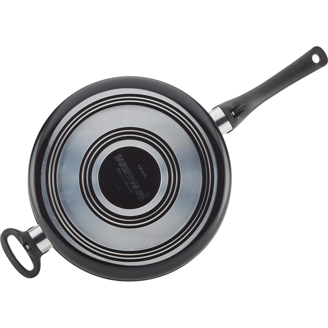 Sear up a panful of garlic shrimp spaghetti or saute onions, ground beef and paprika with the superior ceramic nonstick features of the Farberware Glide Copper Ceramic 4 qt. Saute Pan with Helper Handle. This essential saute pan is constructed from fast and even-heating aluminum, and boasts CopperSlide technology for effortless nonstick food release and easy cleanup of even the stickiest recipes like a honey ginger chicken stir fry. The copper ceramic nonstick is dishwasher safe for easy cleaning, and the easy-hold handle and bonus helper handle provide a comfortable, confident grip to flip, fry and saute with ease. Model: 10652.