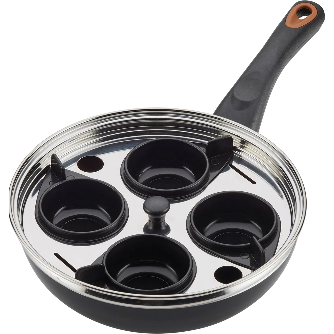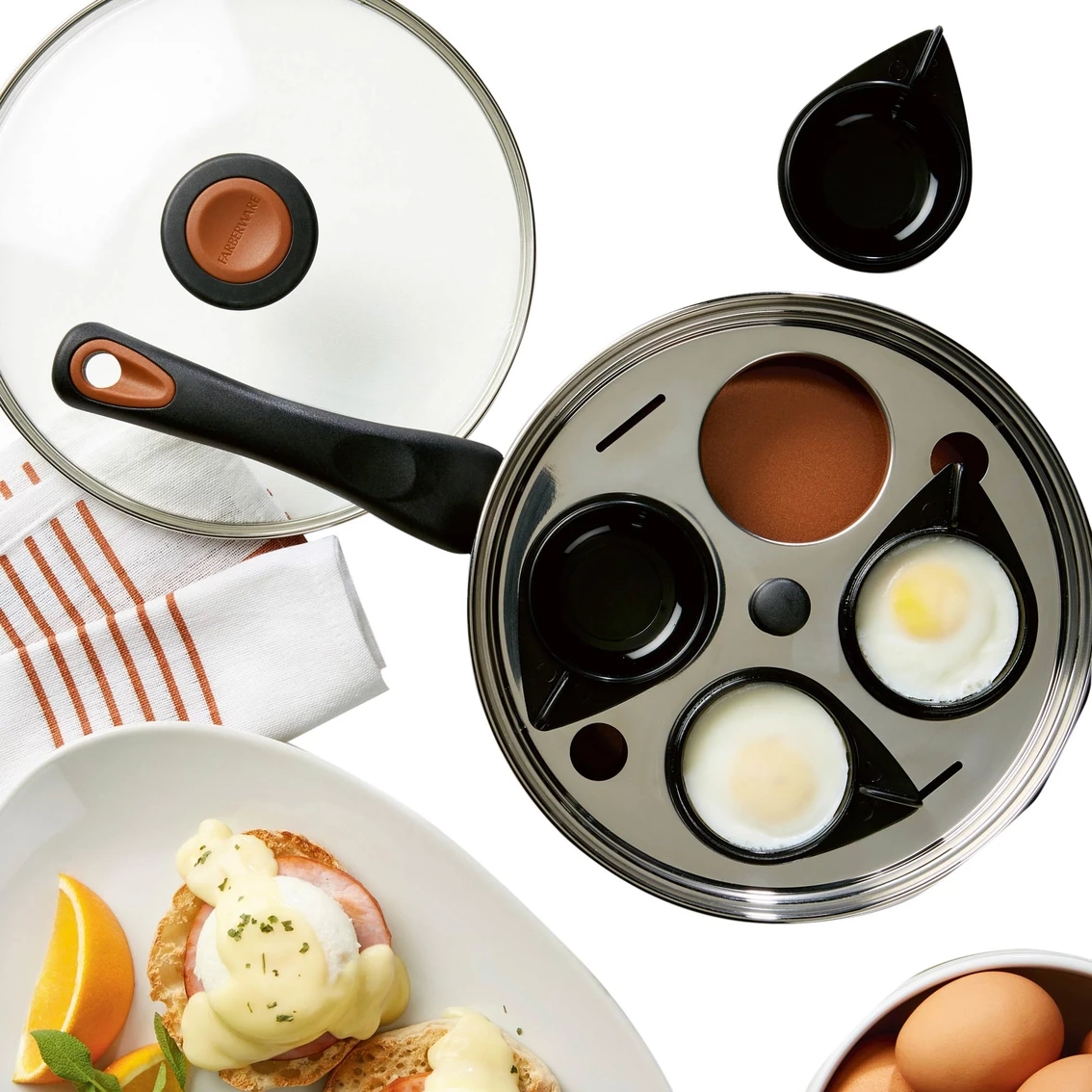 Transform boring old breakfasts into showstopper meals with the superior nonstick poaching performance of the Farberware Glide Copper Ceramic 8 in. Covered Egg Poacher. This versatile 8 in. deep skillet includes four nylon cups to poach eggs into perfect rounds without the mess. The poacher boasts CopperSlide technology for effortless nonstick food release and easy cleanup of even the stickiest recipes like Eggs Florentine or Eggs Benedict with Tarragon Lobster Hollandaise.