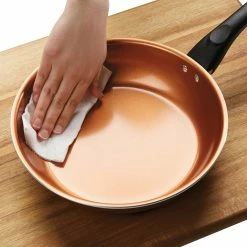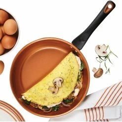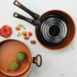 Cook up a family-sized meal with the superior ceramic nonstick features of the Farberware Glide Copper Ceramic Nonstick 12-Piece Cookware Set. This essential collection of saucepans, skillets and a Dutch oven are constructed from fast and even-heating aluminum and boast CopperSlide technology for effortless nonstick food release and easy cleanup of even the stickiest recipes. Saucepans include snug-fitting glass lids to seal in heat and moisture. Easy-hold handles provide a comfortable, confident grip to flip, fry and saute with ease. Pans are oven safe to 350 degrees F for stove to oven versatility. The copper ceramic nonstick is dishwasher safe for easy cleaning. Set boasts three Prestige nylon tools including a slotted turner, slotted spoon and pasta fork so you can start cooking right out of the box.