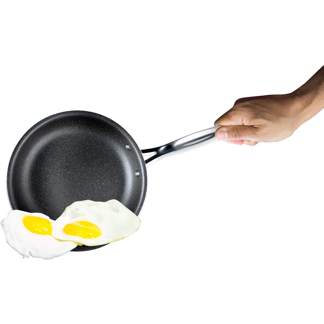 Serve a hearty family breakfast or delicious dinner with this fry pan from Granite Stone Diamond, a roomy 8 in. skillet with a nonstick coating for easy food release and clean-up. Its oven-safe to 500 degrees, compliant with any cooktop including magnetic induction and dishwasher safe. The Granite Stone Diamond fry pan has triple food-grade granite layers for maximum durability and to prevent age or heat-induced warping. This fry pan fits your everyday cooking needs from sauteing, stir frying or searing to baking or frying. It’s also the perfect size for cooking for two, small dishes and cooking eggs. Pressed aluminum inner layer for high heat conductivity and for even surface heating (perfect for searing steaks!). Granite Stone is oven-safe up to 500 degrees Fahrenheit or 260 Celsius. Cool touch handles. This toxin-free, ceramic nonstick, PFOA-free frying pan boasts a scratch-resistant surface. Suitable for all stovetops including gas, electric, halogen, induction or ceramic. Metal utensil-safe. Model: 2591.