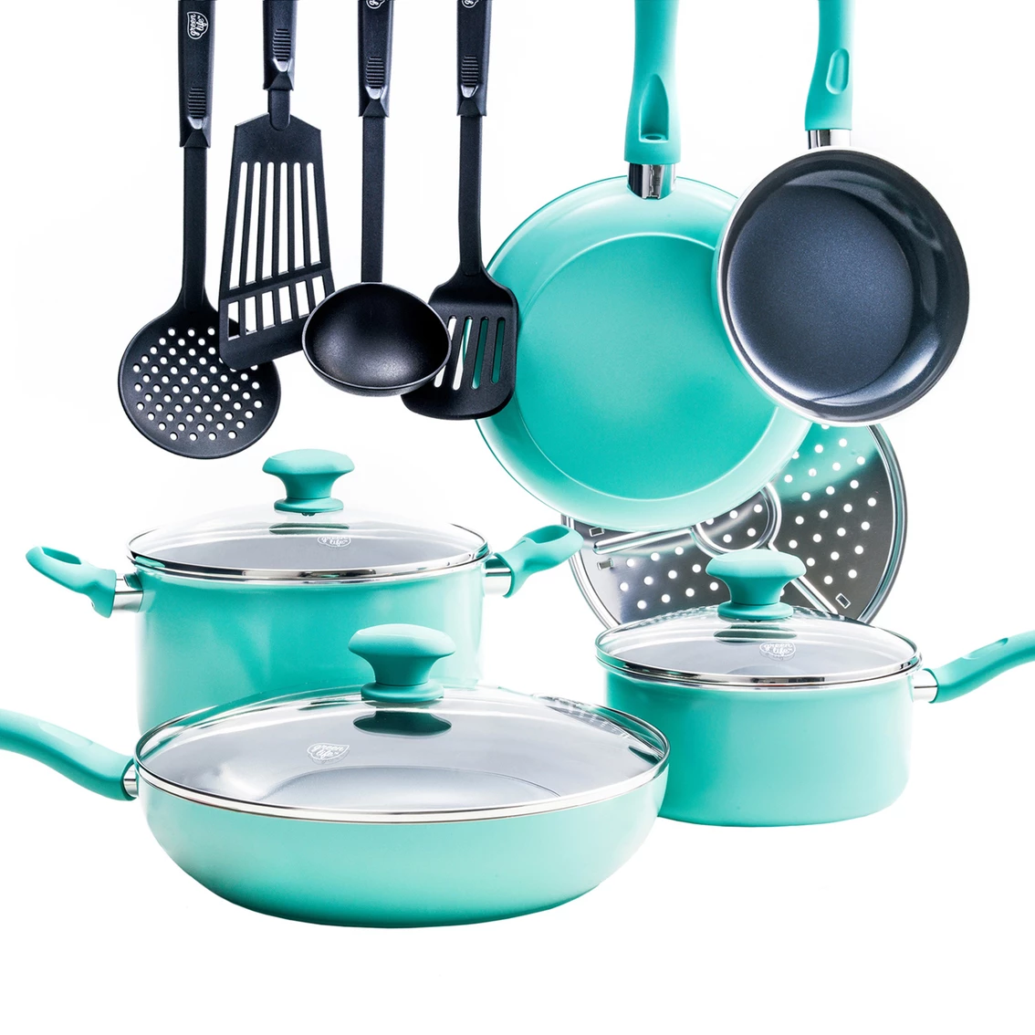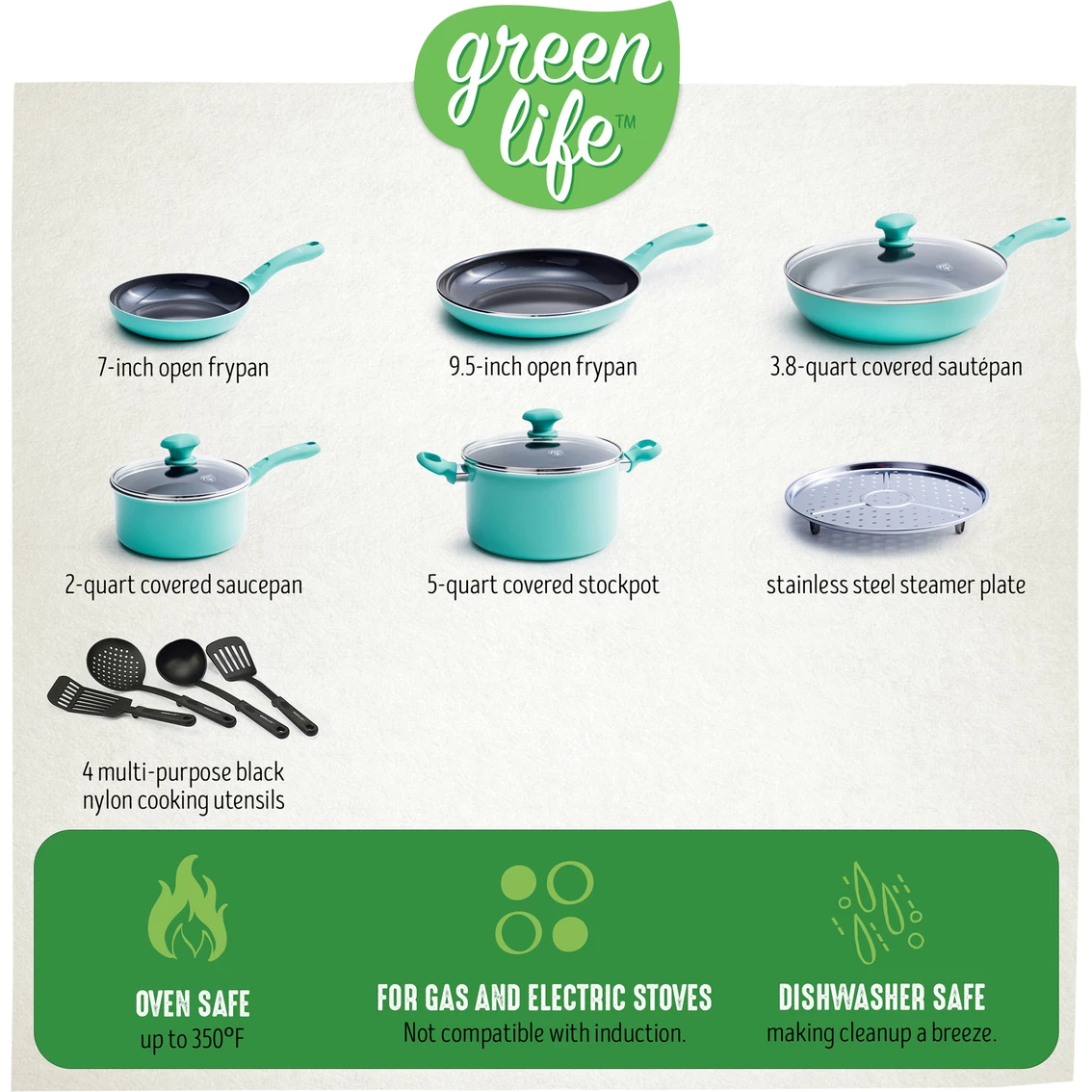 Includes: 7 in. and 9.5 in. frypans, 2 qt. saucepan with lid, 3.8 qt. saute pan with lid, 5 qt. casserole with lid, stainless steel steamer plate and four nylon utensils (two spatulas, ladle and slotted spoon).
