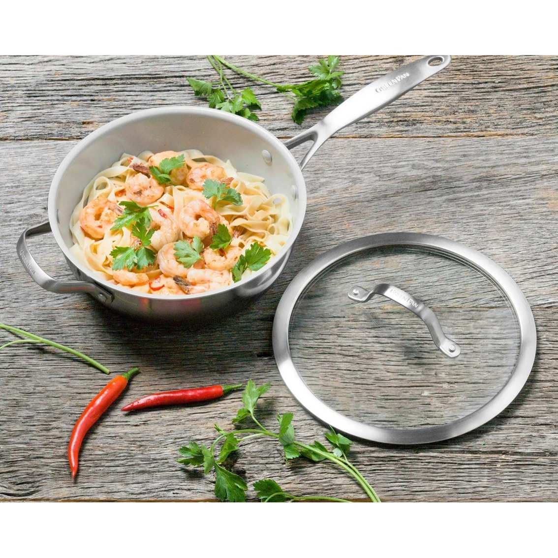 Looking for extra durable cookware with a timeless design, perfect for everyday use? GreenPan Venice Pro 3.5 qt. Ceramic Non-Stick Covered Chef’s Pan with Helper Handle is the eternal favorite. The multilayer stainless steel body is stylish, handy, and suitable for all cooking surfaces including induction and enforced with Evershine technology, applied to the exterior body of your cookware to avoid discoloration and keep your stainless steel looking new. The interior is coated with Thermolon Minerals, now metal utensil safe and lasts even in the face of intense use and cleaning. Impressed? Wait until you see the trimmed edges to keep your Venice flawless {and} the riveted stainless steel side handles that allow your cookware to quickly go into the oven and glass lids that are designed for easy food monitoring without losing the heat. Model: CC000015.