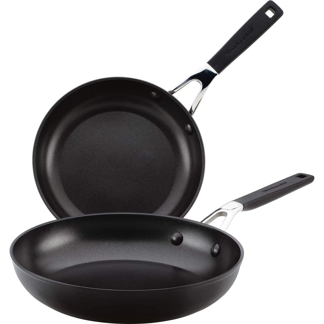 Enjoy crafting meals and signature dishes with the KitchenAid Hard Anodized Nonstick Frying Pan 2 pc. Set. Featuring thick, forged aluminum bases to provide quick heat distribution, while thinner side walls allow the pans to remain lightweight and warp-resistant. These 8.25 in. and 10 in. skillets have been crafted from durable hard anodized aluminum that is 6x harder than traditional aluminum for long-lasting everyday cooking. Fry pan interiors and handle rivets have been finished with triple-layer nonstick to effortlessly release foods and keep the pans looking newer, longer. Dual riveted stainless steel handles are finished with silicone grips to remain cooler while cooking when compared to traditional stainless steel handles. Oven-safe to 400 degrees F for stove-to-oven cooking and creating a wide range of recipes. Model: 84803.
