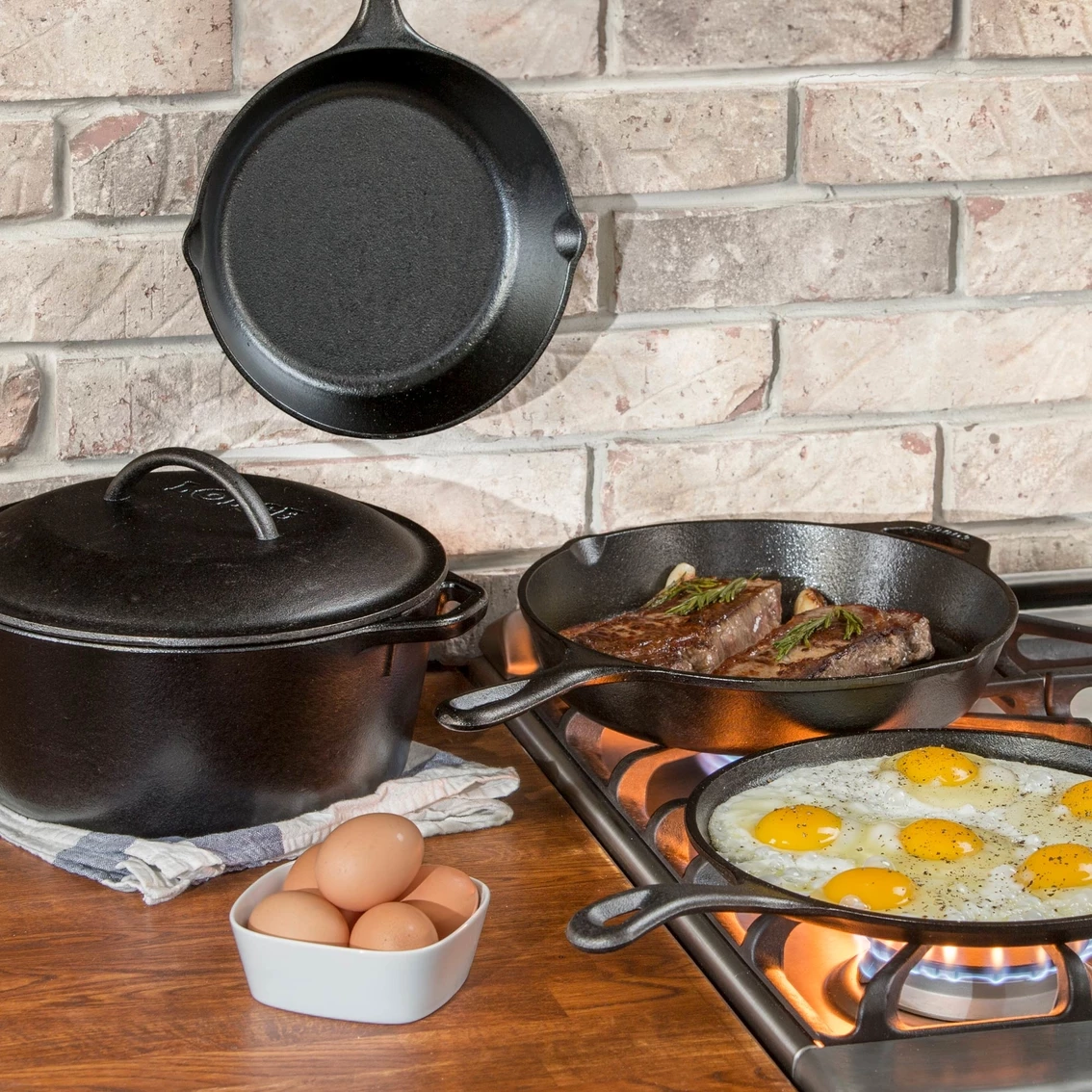 The Lodge Cast Iron 5 pc. Cookware Set is an all inclusive set. It combines the most needed cast iron cookware for a complete kitchen and offers unparalleled heat retention as you perfect your searing, sauteing, simmering, baking, broiling, braising, frying, roasting and grilling. This set includes: 10.5 in. Griddle, 8 in. Skillet, 10.25 in. Skillet, 5 qt. (10.25 in.) Dutch Oven and Cast Iron Cover that fits 10.25 in. Skillet and 5 qt. Dutch Oven.