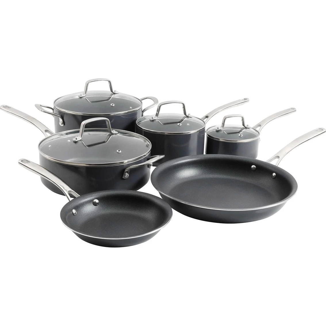 Conquer any recipe with this durable 10-piece hard anodized aluminum cookware set. Sturdy construction and hard anodized material make this set a long-lasting companion to the home chef. Its reinforced nonstick triple coating facilitates your cooking process and helps you get a little more joy out of cooking your favorite recipes. Double riveted, stay-cool stainless steel handles feature a Y-shape design that reduces heat retention in the handle, for a more comfortable grip. Model: 129228.1.
