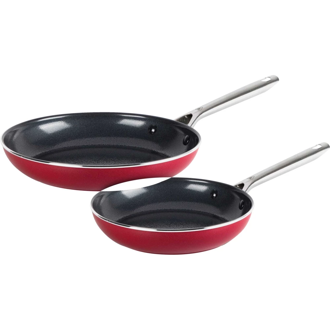 For this set, Red Volcano reached into the depths of the Earth to harness nature’s power. Red Volcano uses Lavaflow technology to fuse ceramic nonstick with plutonic rock, a dynamic substance formed by unbelievable heat and pressure. Each pan has a textured nonstick coating that spreads oil evenly for better frying, plus it’s 10x longer lasting and heats 5x faster than traditional coatings! Incredibly strong and long lasting, plutonic rock can even stand temperatures up to 1400 degrees F! This unique coating is specially designed to transfer heat quickly for unbelievable searing and browning, plus the texture enhances nonstick performance. Free of PFAS, PFOA, lead and cadmium, this coating is toxin-free so you can cook with worry. Designed for daily life, these pans are metal utensil safe. Heavy-gauge forged bases keep these pans from warping and wobbling. Dishwasher safe for easy cleanup. Cook in the red zone! Set includes: 7 in. frying pan and 10 in. frying pan.