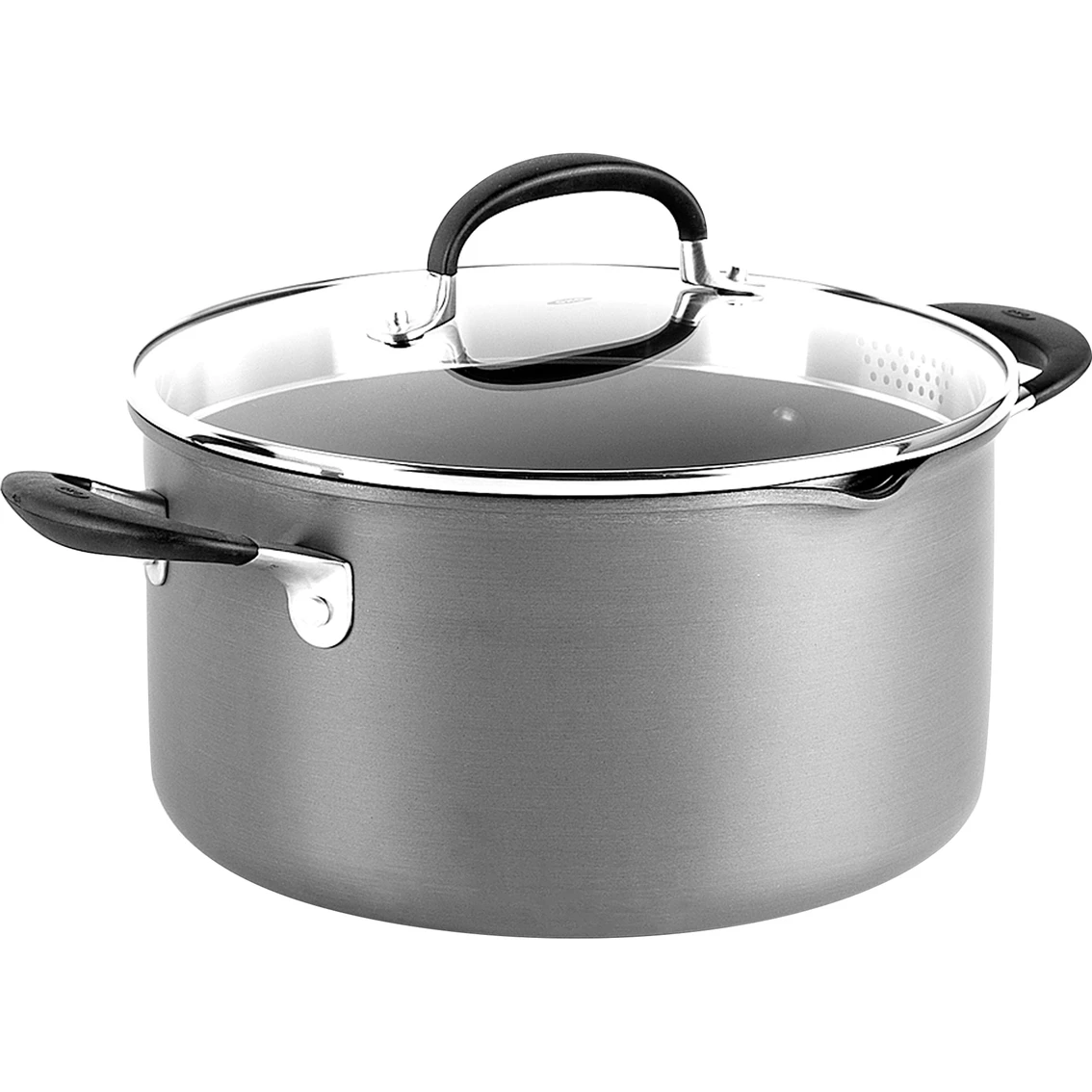 This pot from the OXO Good Grips Nonstick collection is specially designed to make straining easy. A handy side spout and lid with variable sized holes helps you strain without worry. Three layers of German-engineered PFOA-free nonstick coating provides years of effortless food release using less oils. Hand-anodized, scratch-resistant hard-anodized aluminum ensures superior heat conduction and even cooking. Clear, tempered glass lid for an easy look at your food without losing heat. Oven safe, silicone-metal construction allows cookware to move directly for stovetop to oven. Oven safe up to 390 degrees F/200 degrees C. Perfect for all types of stovetops, except induction. Model: CC002664-001.