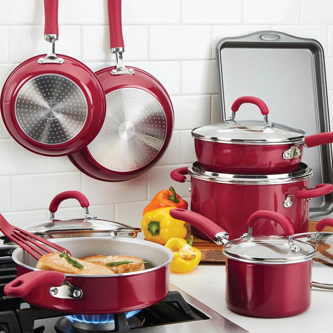Colorful, double riveted stainless steel and silicone handles provide comfort and control that’s oven safe to 400 degrees F, and shatter resistant glass lids lock in heat and flavor while allowing foods to be monitored while they cook. Flared cookware rims make for easy pouring, and an induction-suitable stainless steel base provides strength, durability and versatility to use the cookware on any stovetop. Included in the 13-piece set, a 9 in. by 12 in. cookie pan is ready for chicken wings and cookies alike, and the nylon turner will have you ready to flip and serve from the get go.