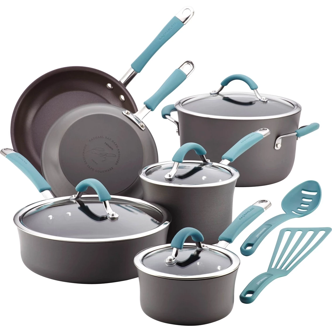 Create numerous delectable meals and countless cherished memories with the Rachael Ray Cucina Hard-Anodized Nonstick 12-Piece Cookware Set. The durable pots and pans in this stylish, practical cookware set are sturdily crafted from hard-anodized aluminum which provides fast, even heating and help to reduce hot spots that can burn foods.