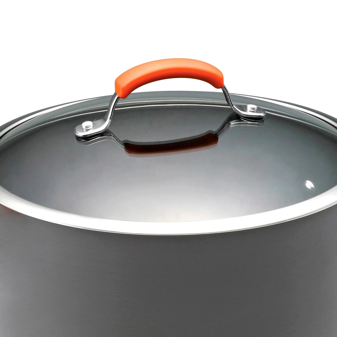 The brightly colored, grippy handles are rubberized for comfort and double riveted for strength. A shatter-resistant glass lid makes it easy to monitor foods while they cook without losing heat or moisture. This stockpot is oven safe to 350 degrees F and dishwasher safe for convenience, plus it complements many other pieces in Rachael’s collections.