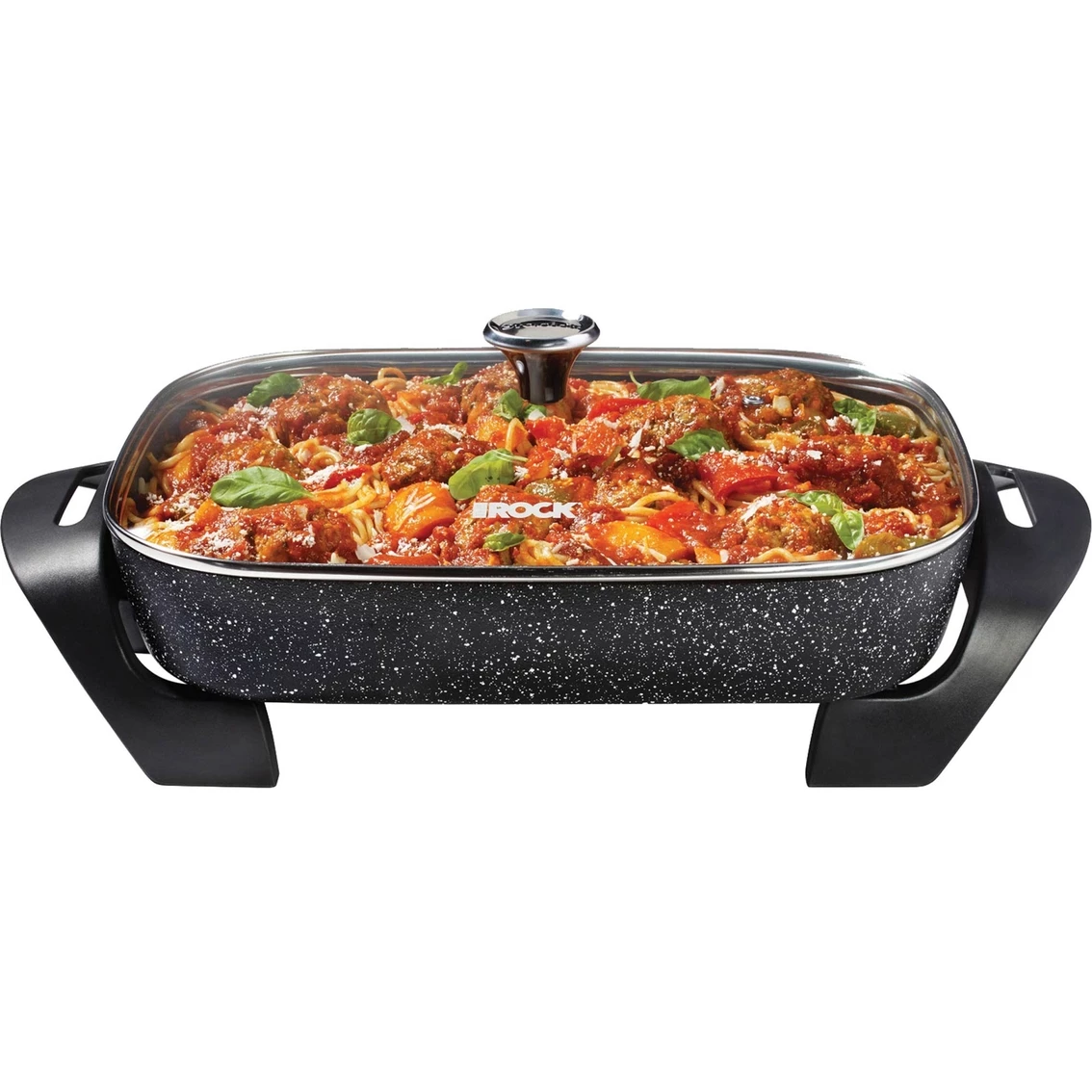 The Rock by Starfrit 12 in. x 15 in. 1200W Extra-Large Electric Skillet with Glass Lid is your partner for healthy cooking as you prepare delicious homemade meals in minutes. Its extra-large surface allows for family size recipes. The extra-thick base will give you an even heat distribution to cook your favorite dish quickly with less energy. Designed to go from the kitchen to the dinner table, you will impress your family and friends by serving your favorite recipes directly in the electric skillet. The patented Rock.Tec surface treatment offers enhanced nonstick cooking so you can enjoy your meal without having to worry about cleaning. The possibilities are endless. Model: SRFT024401.