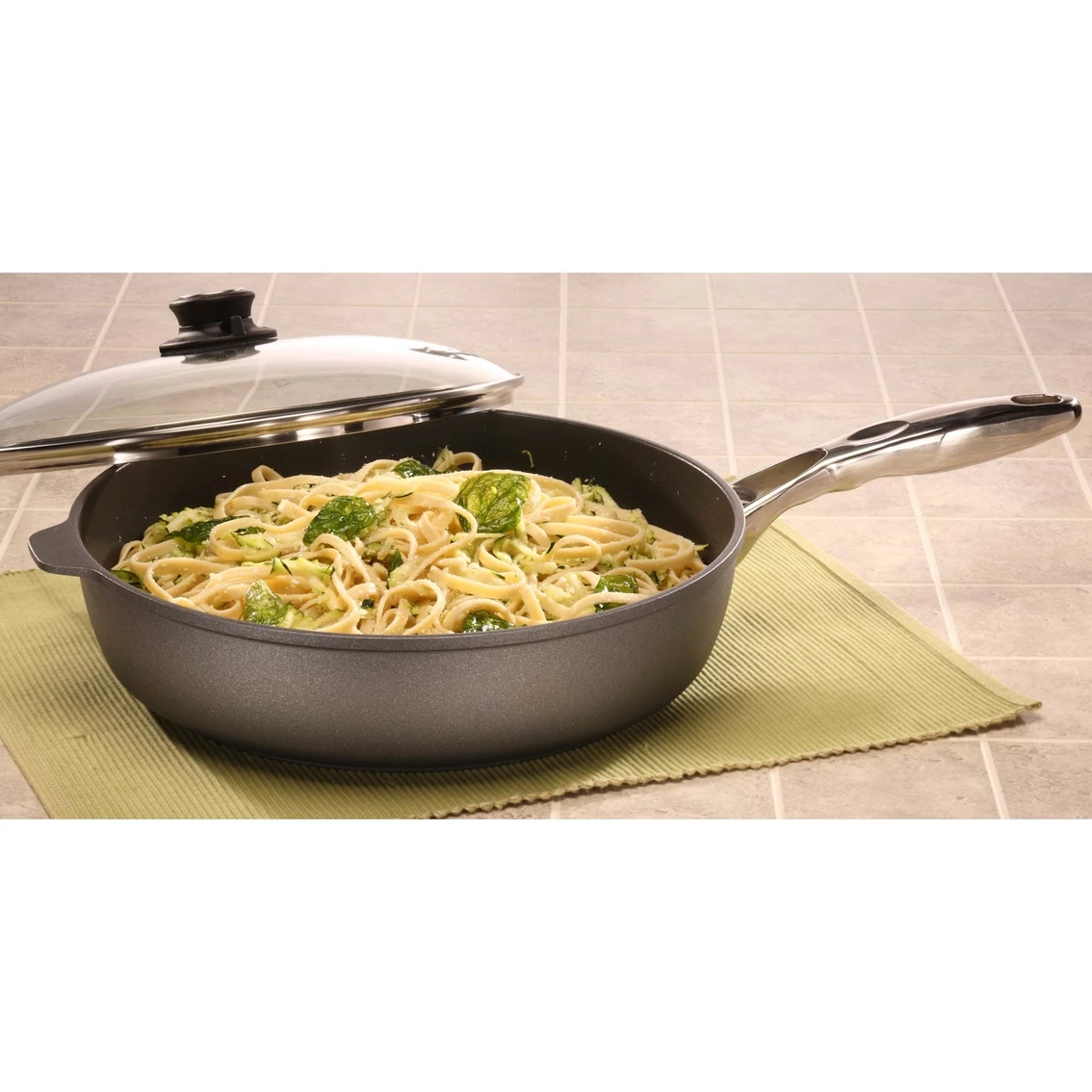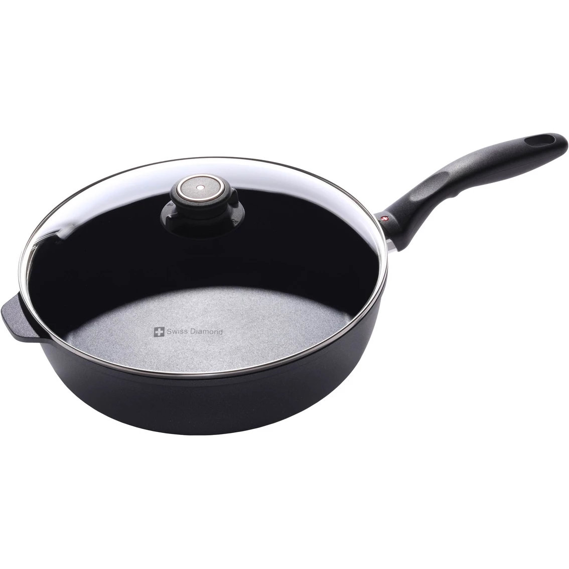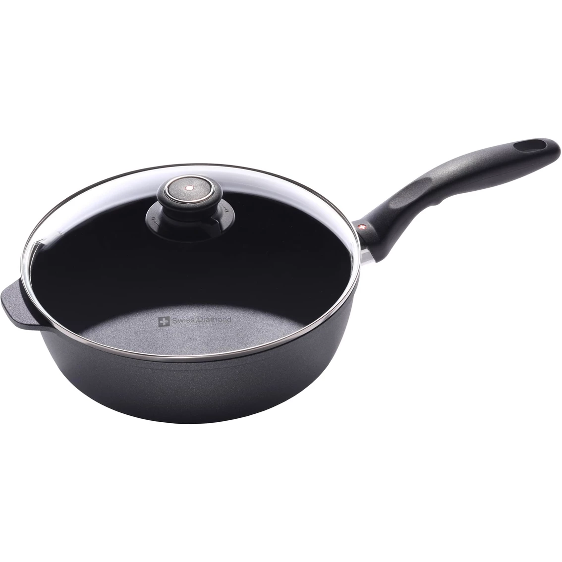 The Swiss Diamond Saute Pan is ideal for cooking enthusiasts in search of a versatile addition to their cookware collection. Perfect for meat, vegetables, sauces and more, this high quality and durable pan is guaranteed to transform your everyday cooking experience. The cast aluminum body distributes heat evenly and efficiently to warm contents evenly without hot spots so that less stirring is required. The patented diamond-reinforced nonstick coating contains real diamond crystals and consistently delivers delicious results followed by easy clean-up. The coating ensures immediate release of food particles to make clean-up a breeze! Simply wash with hot soapy water and a gentle sponge-no more scrubbing or soaking dirty pans. This saucepan is oven-safe up to 500 degrees F (260 degrees C). Model: 67.
