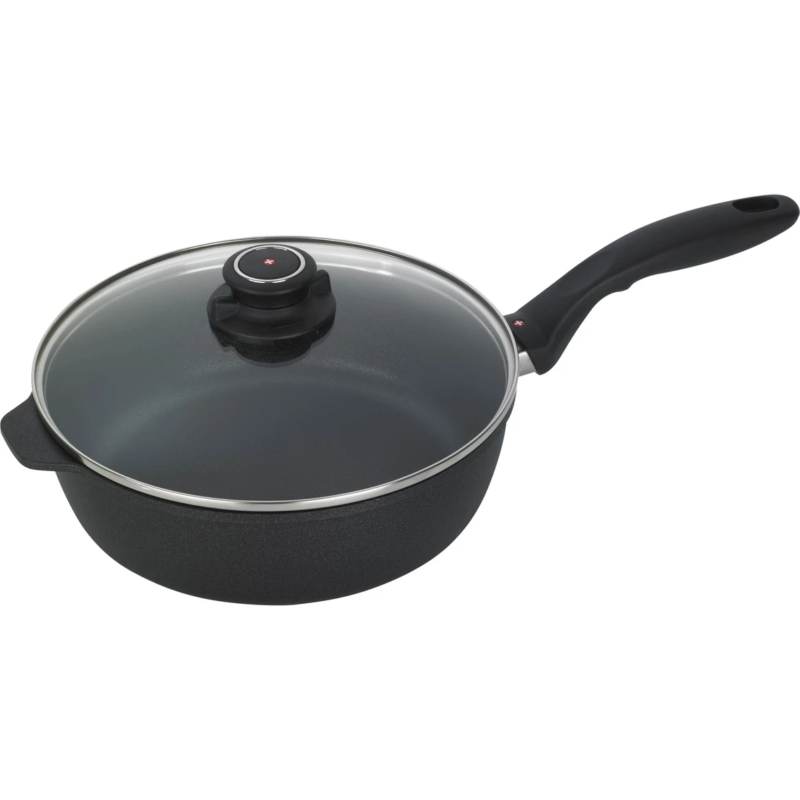 The Swiss Diamond XD Saute Pan with Lid will transform your everyday cooking experience into something spectacular. The new Swiss Diamond XD nonstick coating contains 20 percent more diamonds than previous Swiss Diamond HD nonstick coatings. Combined with the cast aluminum body, it creates a tougher, more corrosion resistant layer for an increase in both durability and food release. This saute pan browns meats and caramelizes like stainless steel, yet has the remarkable food release nonstick qualities. Use the heat-tempered glass lid to monitor your food, and the adjustable steam vent knob to truly lock in as much flavor as possible. The extra thick, cast aluminum body features a perfectly flat base that will not tip, spin or warp while cooking. The ergonomic handle on this pan provides a comfortable grip that allows you to shake, toss and stir your foods with ease. PFOA-free and manufactured using an eco-friendly production process, you can rest assured that your cookware is safe for you and your loved ones. With warm water and a soapy sponge you will be able to wipe clean even the toughest of food residue. The surface of this saute pan will provide years of trouble-free cooking and easy cleanup. Model: XD6728C.