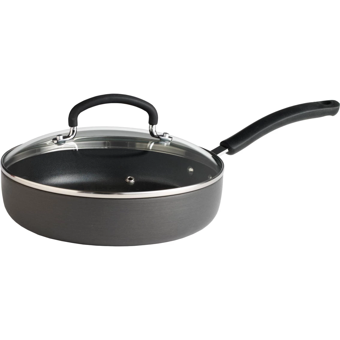 The heavy-gauge aluminum cookware features a Thermo-Spot heat indicator that clearly shows when it’s perfectly preheated to seal in flavor. A patterned nonstick interior is exceptionally durable, scratch-resistant and safe to use with metal utensils. The TechnoResist base of the pan is warp-resistant and provides even heat distribution. Venting tempered glass lid. Riveted silicone handles. Oven safe to 350 degrees F. Model: E9189774.